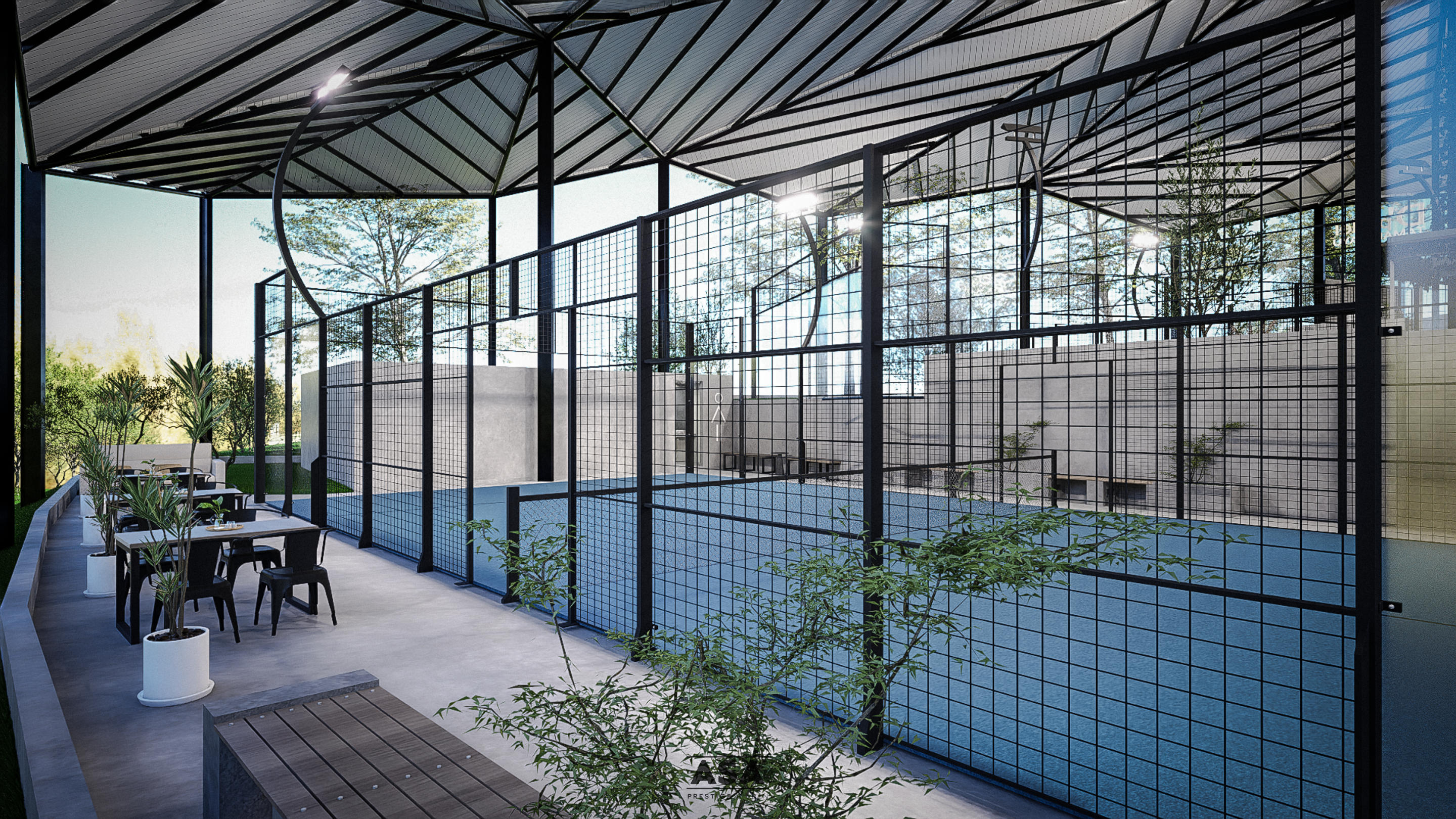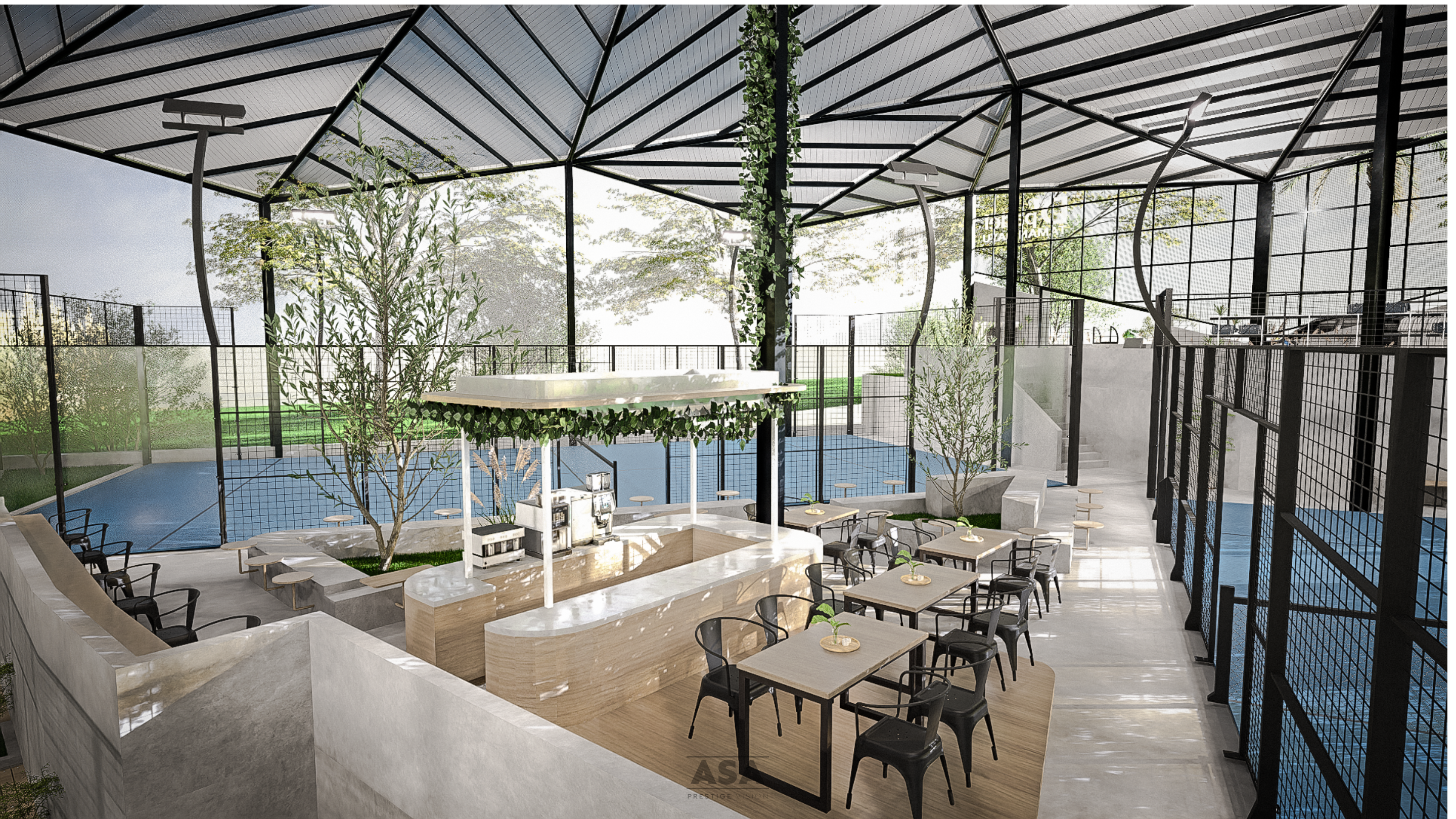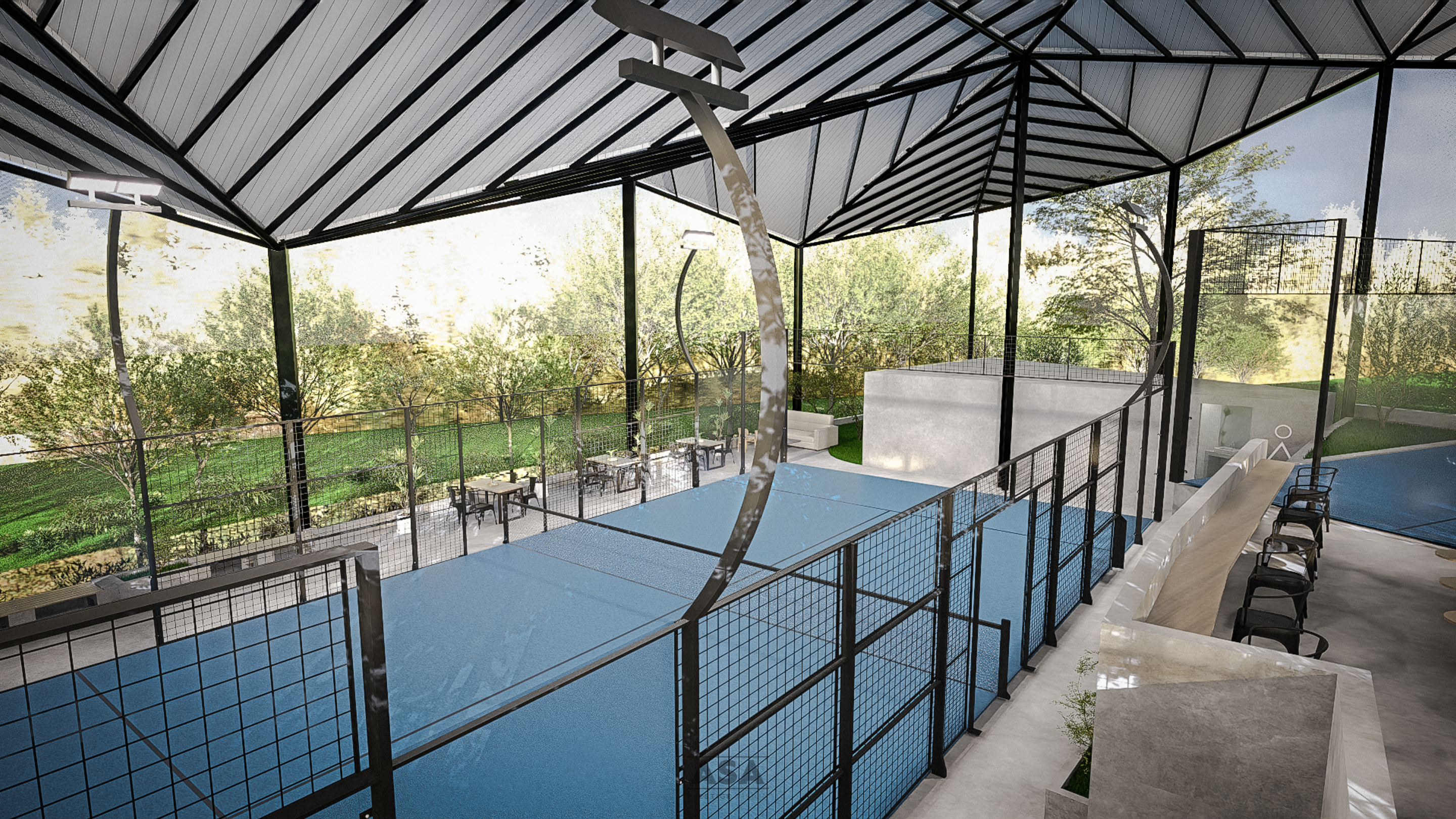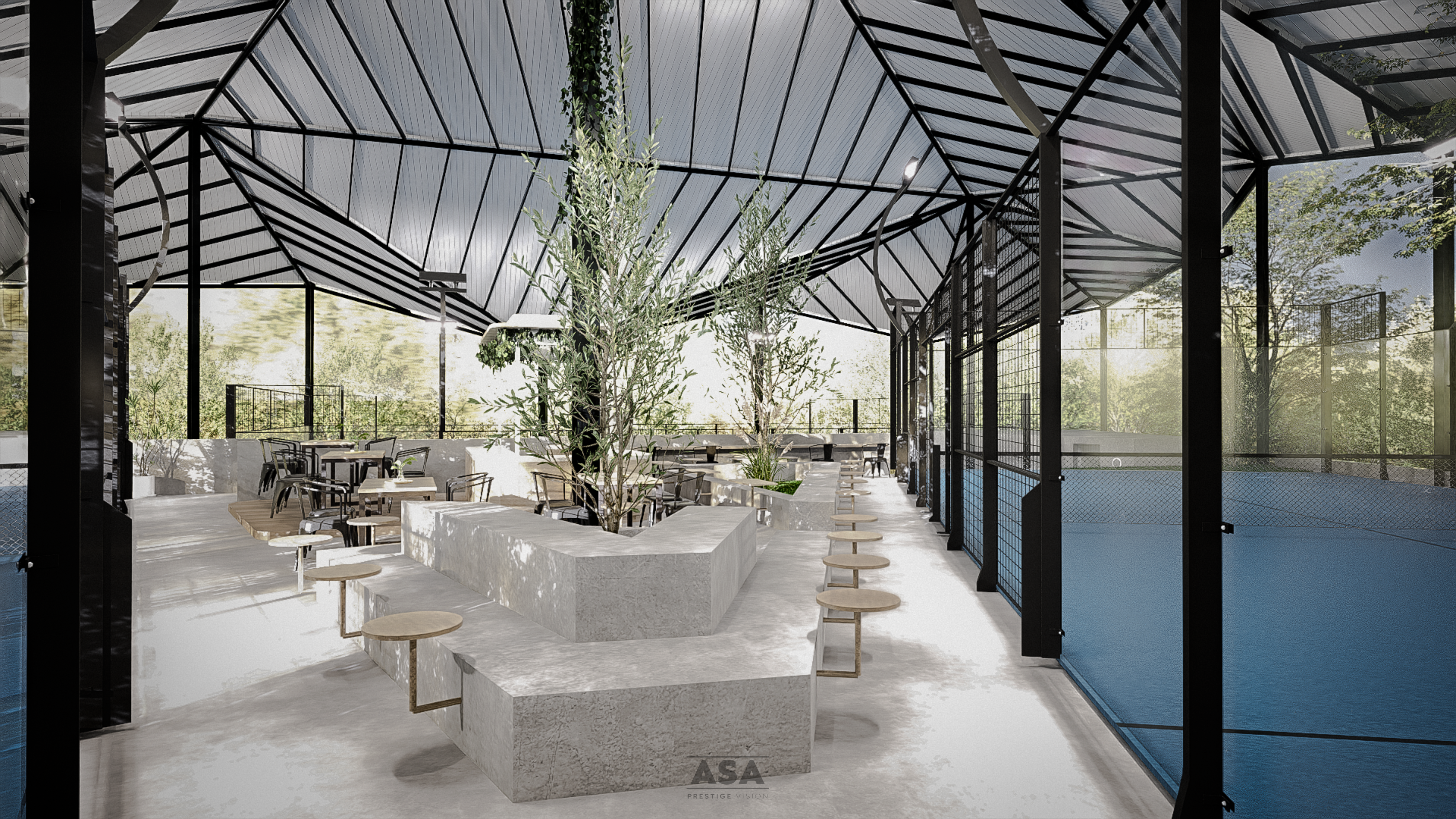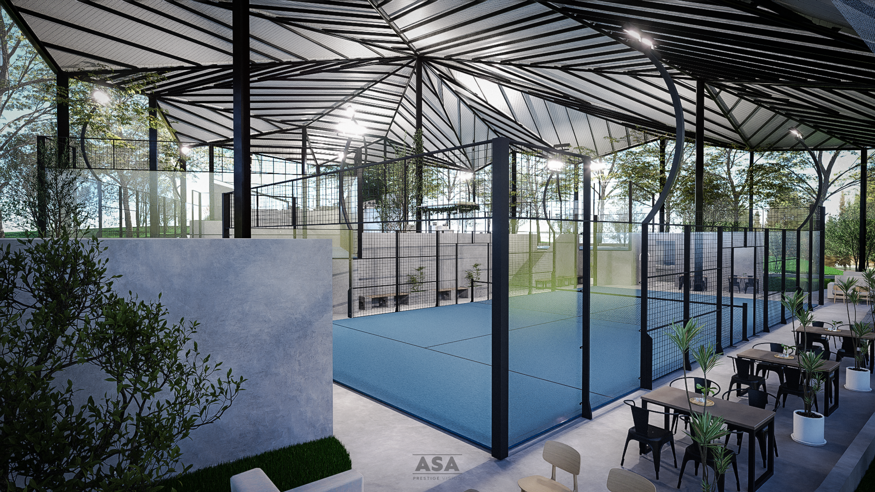 This world-class padel facility is a masterclass in modern industrial design, offering an elite sporting environment that transitions seamlessly from play to leisure. The architecture features a soaring, high-clearance steel structure and an expansive translucent roof, flooding the professional blue-turf courts with soft, natural light while providing total protection from the elements.