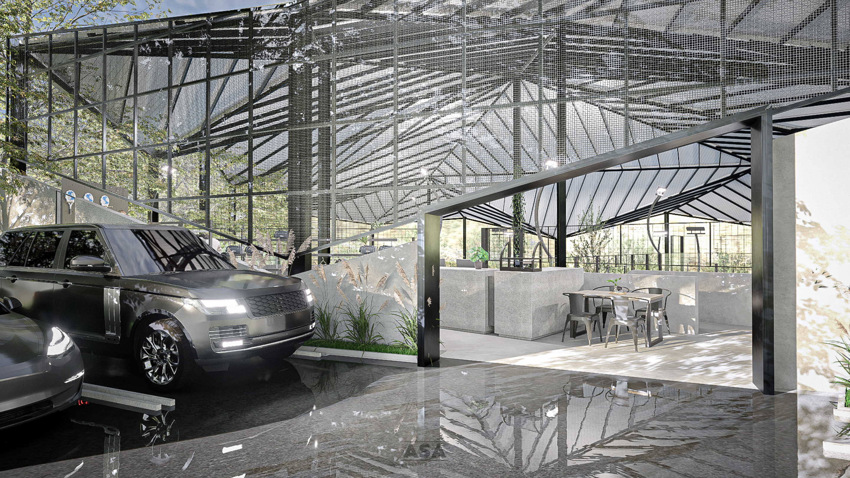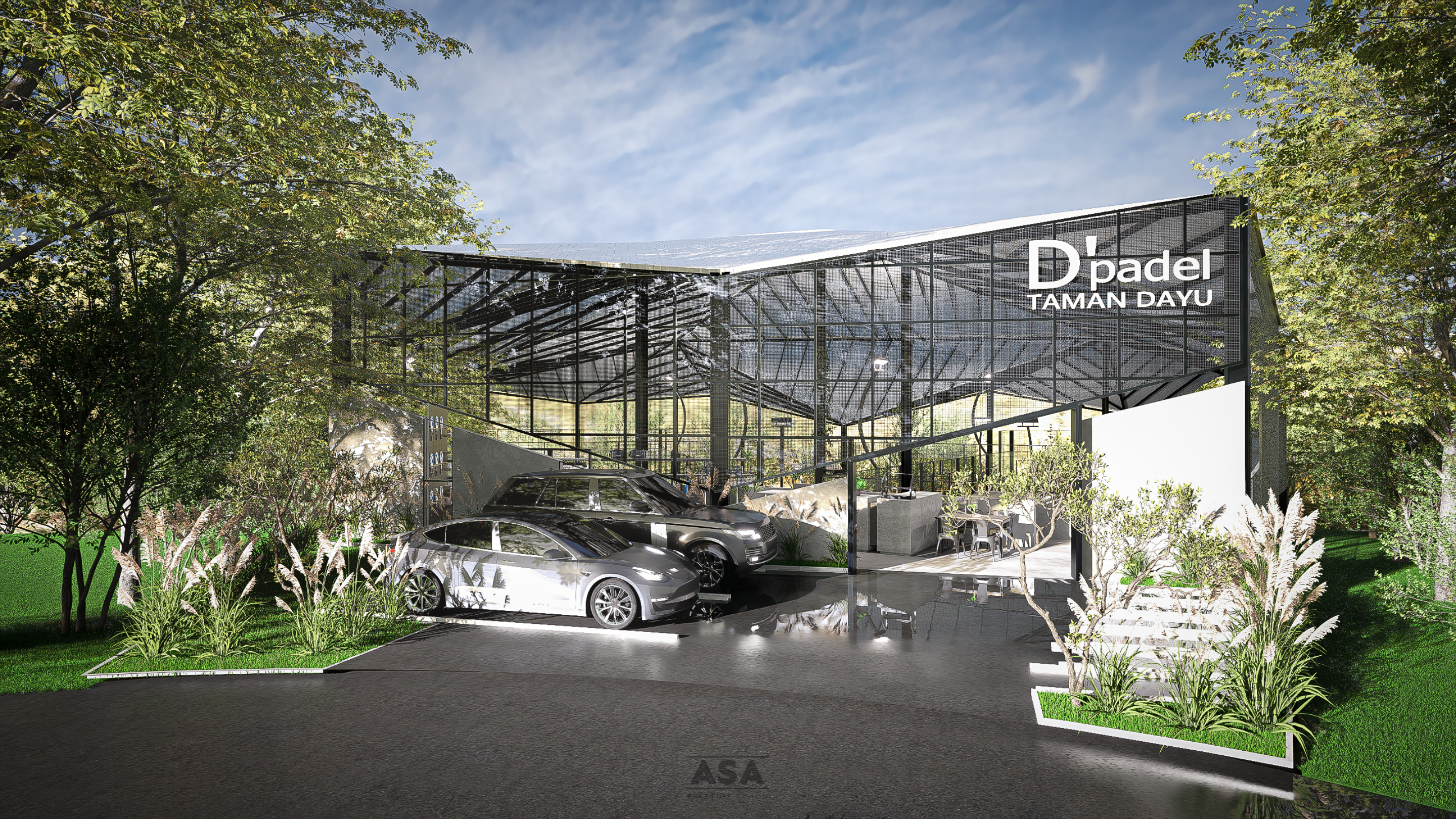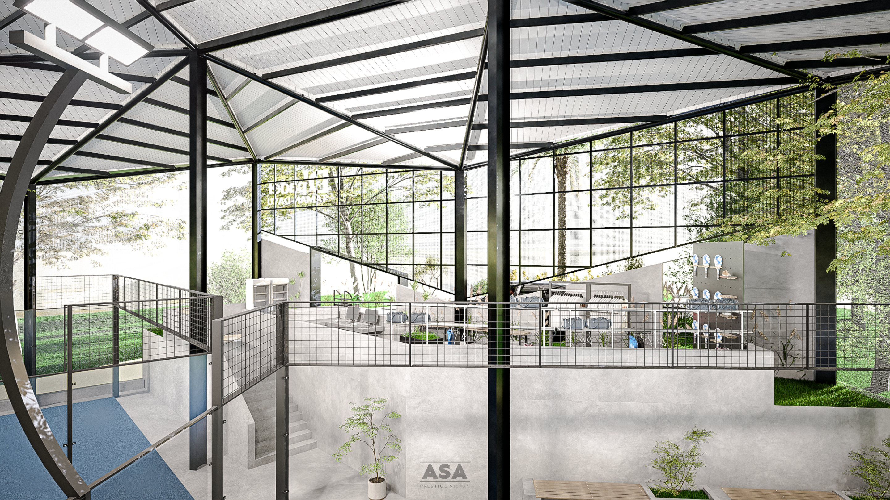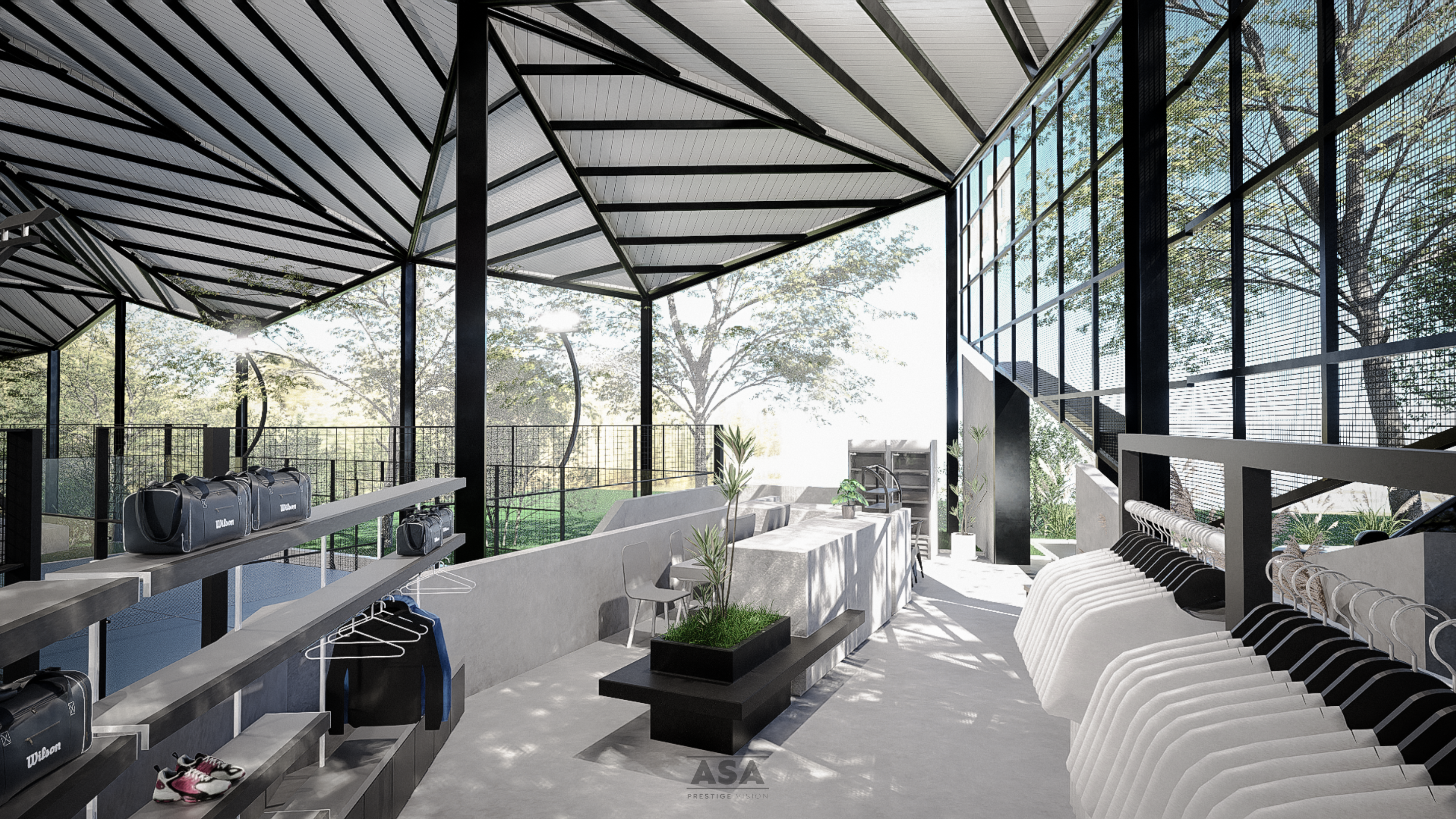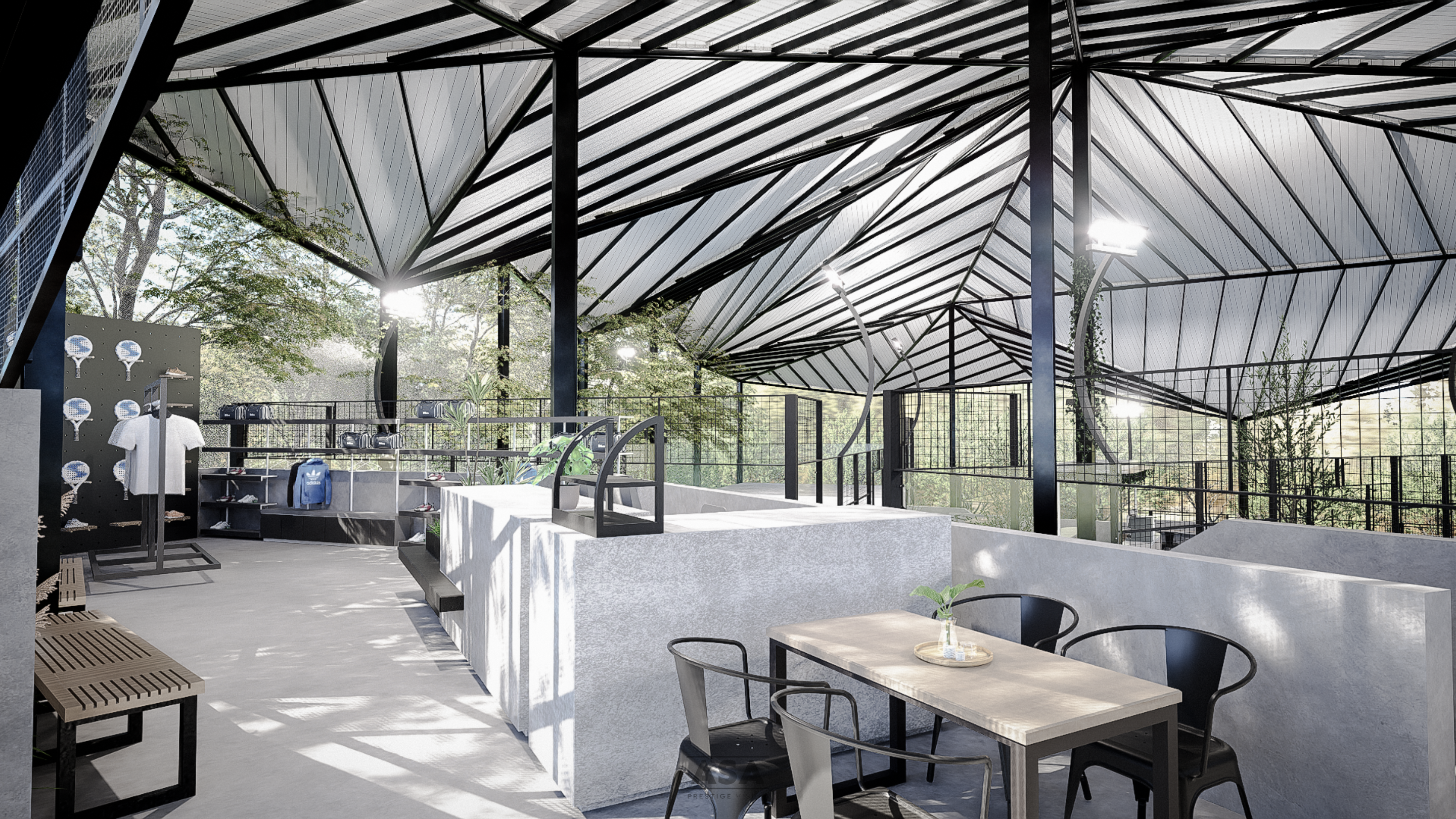 This world-class padel facility is a masterclass in modern industrial design, offering an elite sporting environment that transitions seamlessly from play to leisure. The architecture features a soaring, high-clearance steel structure and an expansive translucent roof, flooding the professional blue-turf courts with soft, natural light while providing total protection from the elements.